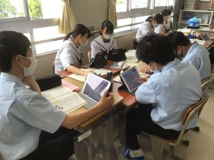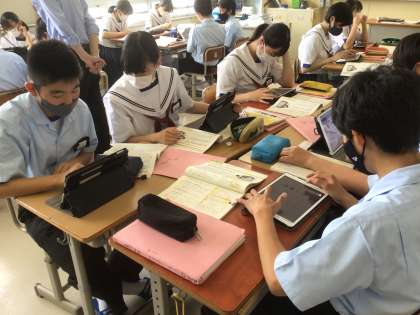 ゴミ袋に記名をするかどうかについて、「する」「しない」双方のメリットとデメリットを学習用タブレットに洗い出していました。