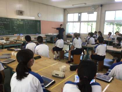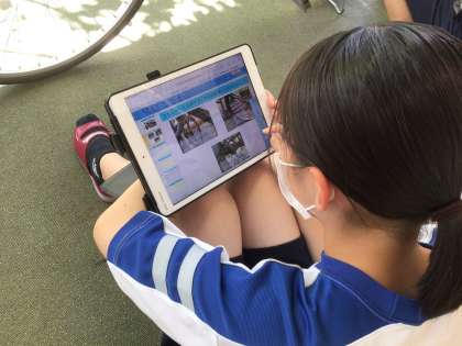 自転車のどこに運動エネルギーが働いているのか、実物を見ながら考え、学習用タブレットにまとめていました。