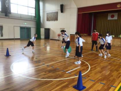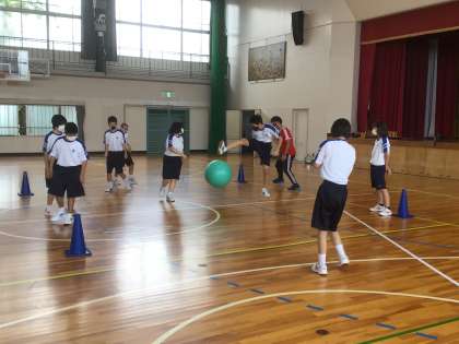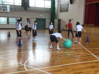 バランスボールを使って、ボールゲームをしていました。