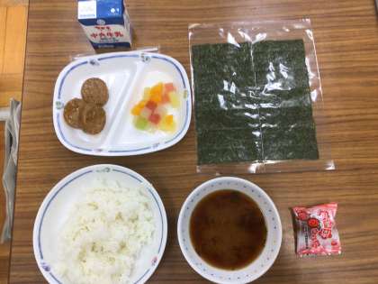 ご飯、牛乳、備蓄用みそ汁、フルーツポンチ、ごまつくね、梅干し、おにぎりのりです。