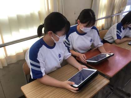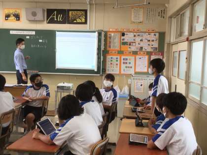 学習用タブレットの発表ノートにまとめた考えを見合い、発表していました。