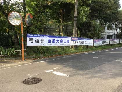 正門横に、今年度全国大会に出場した弓道部の横断幕を設置しています。