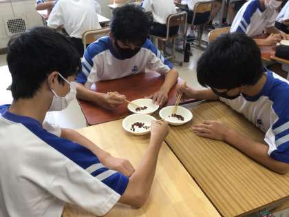 小豆を箸でとって相手の器に入れ合い、自分の器に残った数が相手より少なければ勝ちです。