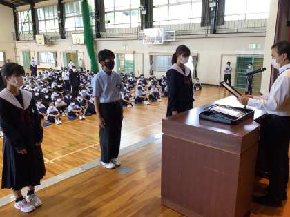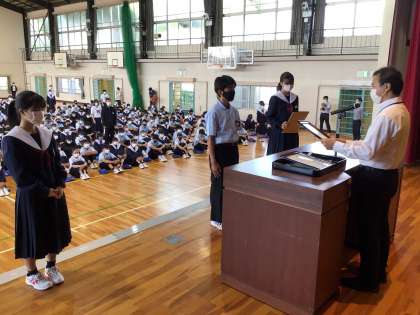 始業式前に同じく上中賞の表彰を行いました。学年学校のため様々なところで活躍したことに対しての表彰です。
