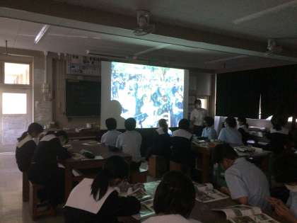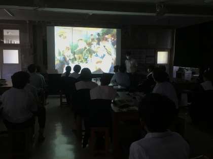 大画面に映し出された著名な作家の作品を鑑賞し、時には質問されたことについて考えていました。
