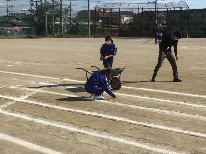 5時間目に3年生が体育祭の会場設営をしています。