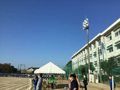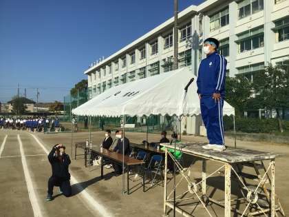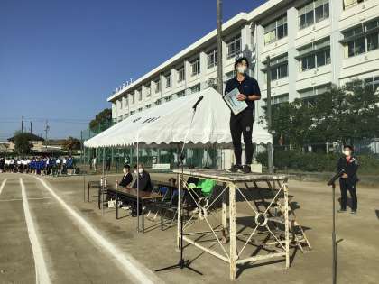写真は、スタッフ長の挨拶、体育主任の競技説明の様子です。
