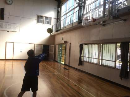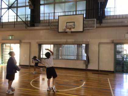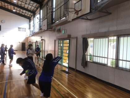 パスの技能を使って、ボールをバスケットゴールに入れるゲームをしていました。