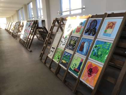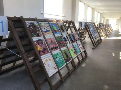 4階の渡り廊下に美術の授業で制作した作品が展示されています。