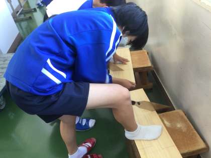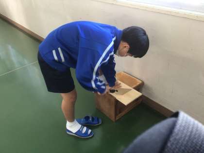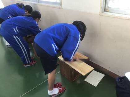 印に沿って、ノコギリでまっすぐに板を切っていました。