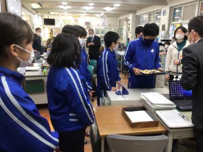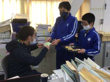 出来上がったスイートポテトを、給食の後に職員室の先生たちにおすそ分けをしてくれました。