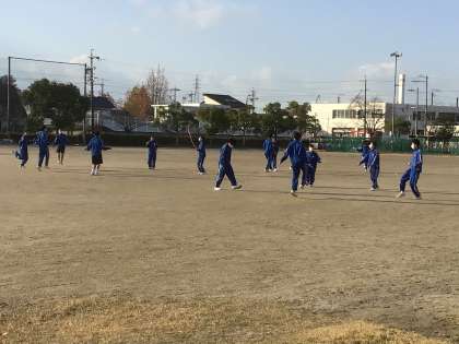音楽に合わせてグループごとに縄跳びでウオーミングアップ。