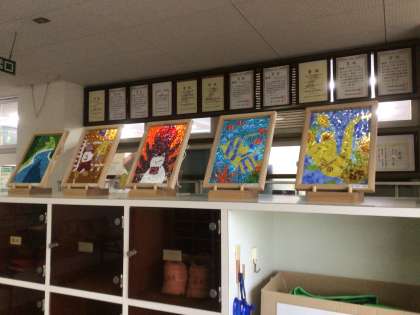 学校の玄関を入ってすぐのところに、3年生が美術の時間に制作したモザイク画が展示されています。