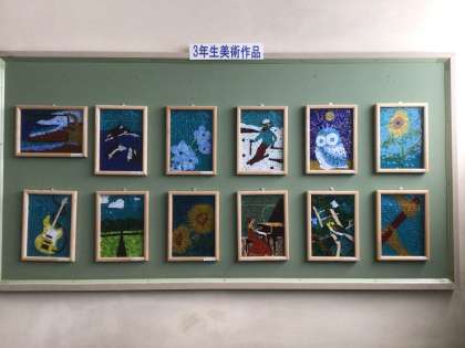 少し前に学校の玄関に3年生のモザイク画が展示されていることを紹介しましたが、北校舎の掲示板にも展示されています。