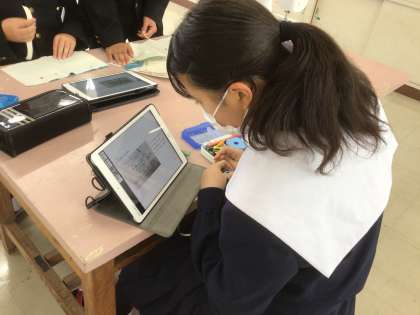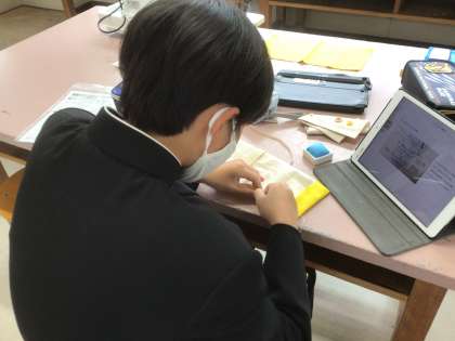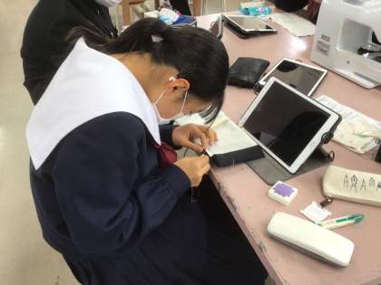 学習用タブレットで縫い方などを確認しながら取り組んでいました。