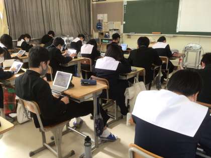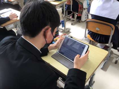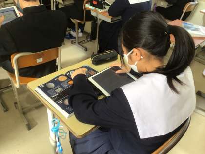 宇宙について学習した後、自分が興味をもったことについて調べ、学習用タブレットにまとめていました。
