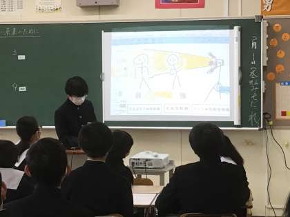 引用資料や手書きの資料も交えてパワーポイントにまとめ、発表していました。