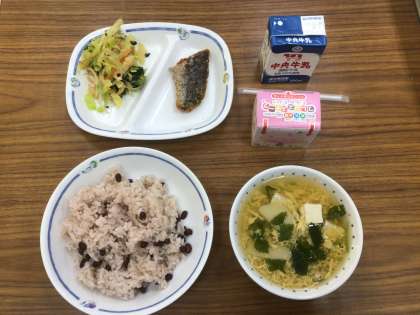 赤飯、かきたま汁、さわらのから揚げ、おひたし、牛乳に、米粉のケーキ(いちご豆乳クリームです)がつきました。
