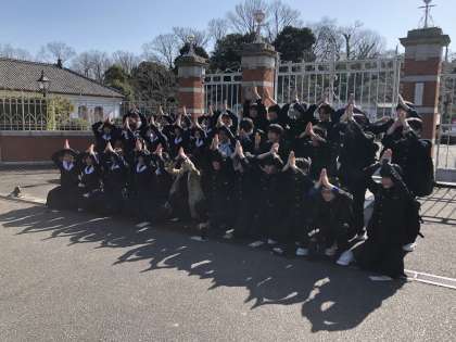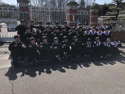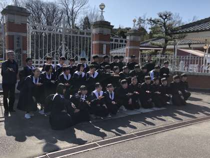 明治村に到着しました。正門で記念撮影です。今から無声堂に向かって移動します。
