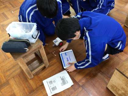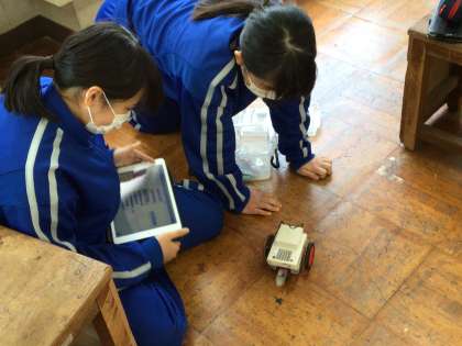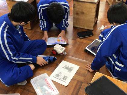思い通りに動くかを見ながら、学習用タブレットでプログラムを確認していました。