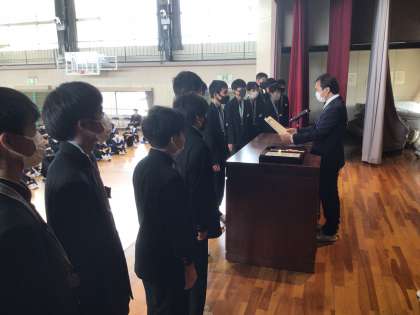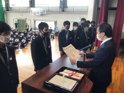 サッカー部が県大会3位となり、教育委員会から表彰されました。