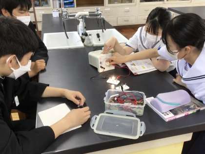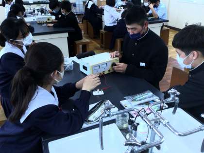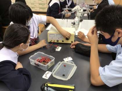 電源装置の使い方を、豆電球を使って学習していました。