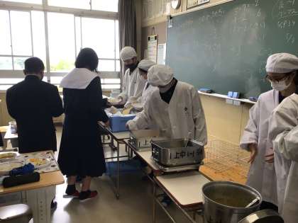 給食準備の様子を見にいきました。