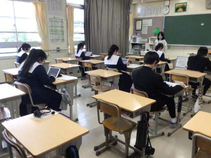 学習用タブレットのキュビナを立ち上げ、ヘッドホンマイクをつけて実施しました。