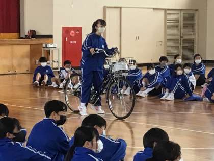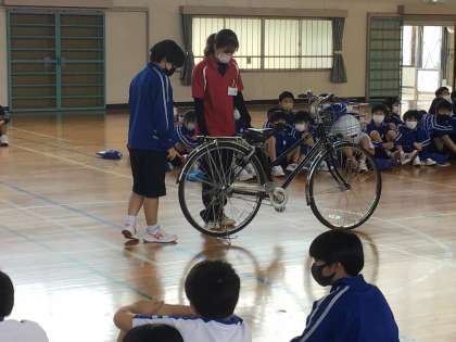 代表生徒が実際に自転車を使って行いました。