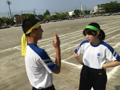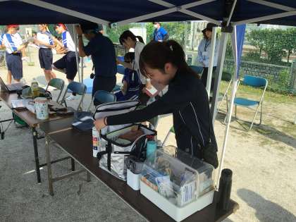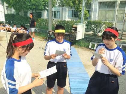 開会式前、司会、選手宣誓の生徒は緊張の中心を整えています。保健の先生も暑さ対策はバッチリ。いよいよ体育祭が始まります。