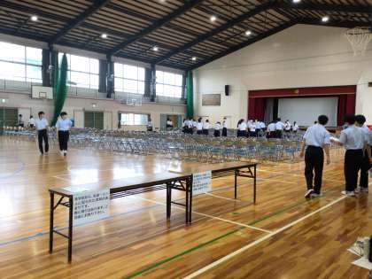 登校後に3年生の多くの生徒が会場準備をしていました。 ごくろうさまでした。