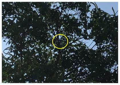 ピントがうまく合いませんでしたが、黄色の丸の中にいるのがクマゼミです。