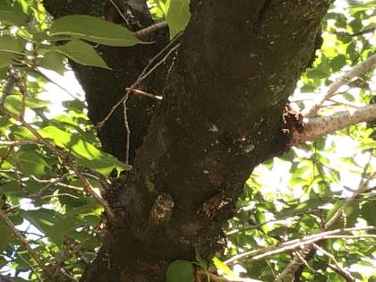 ふと見ると、クマゼミとアブラゼミが隣同士で木にとまっていました。