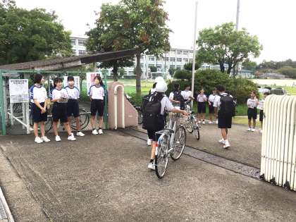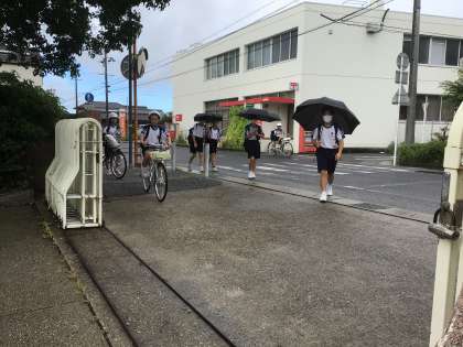 「突然雨が降ってきました」と言いながら門を通る生徒がいました。
