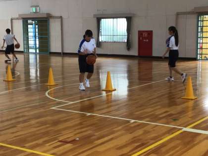 ドリブル練習では、チャレンジとして背中側からボールを回すことに挑戦する生徒もいました。