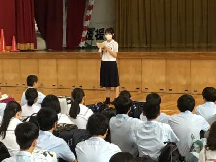 出発式が始まりました。級長会長の「マナーを守って楽しい旅行にしましょう」という力強い言葉でこの旅行がスタートします。学年主任の先生、校長先生からは、自然教室の3年生の素晴らしい姿についてお話がありました。修学旅行では、さらに成長した姿が見られると思います。最後に留守番の教頭先生に向かって「行ってきます!」の元気の良い挨拶で出発です!