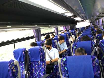 車内はそれぞれの座席に収まり、東京までの自分の巣作りに勤しんでいます。定刻にバスは出発しました。お見送りの先生方が手を振っています。犬のエンブレムのバスに乗って一路東京へ向かいます。次の目的地は掛川PAです。しばらくはバスでくつろいだ時間が流れています。