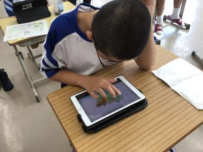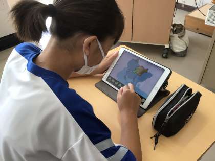 授業のはじめに、学習用タブレットで市町村パズルをしました。