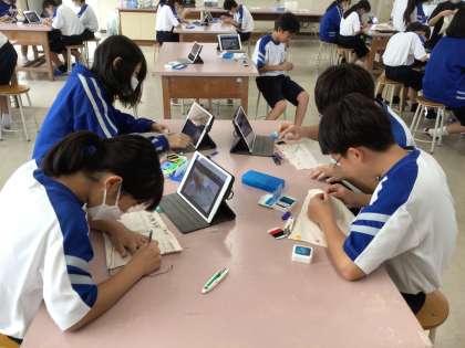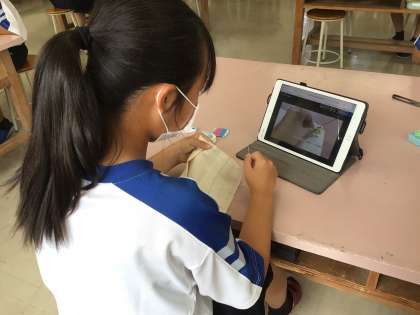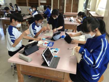家庭科の時間にボタン付けに挑戦していました。
