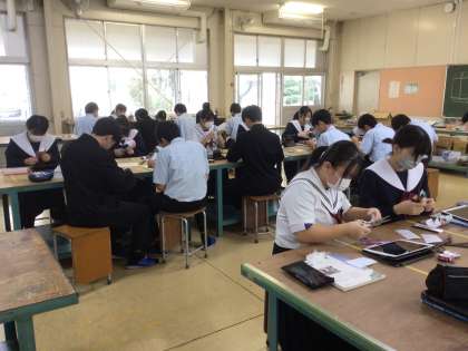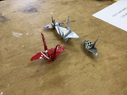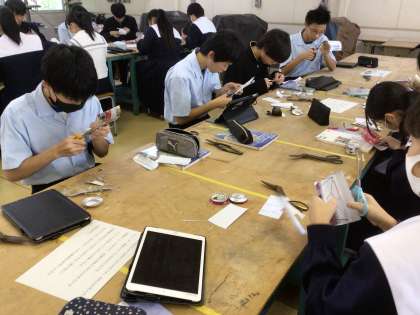 アルミ缶を切り開いて、展開図を切り取っていました。
