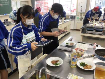 出来上がったら盛り付けをし、学習用タブレットで写真に記録します。