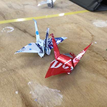アルミ缶の鶴が完成していました。