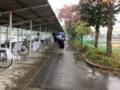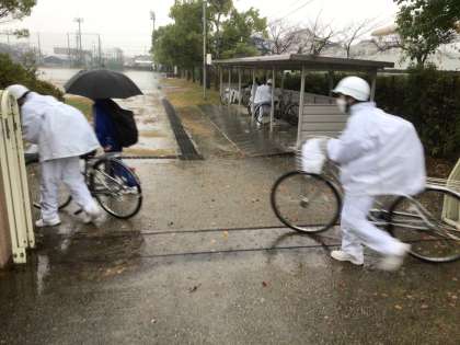 カッパを脱ぎながら、「やばいですよ」と濡れてしまったジャージを見せてくれた生徒がいました。