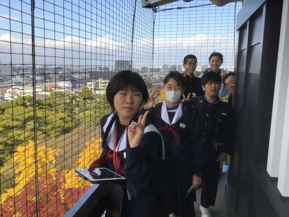 いよいよ最上階です。上郷中学校の方向で記念撮影です。岡崎城から上郷中学校は見えるかな?とても良い景色です。