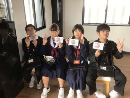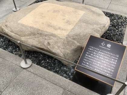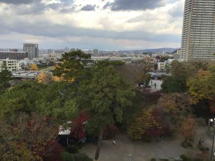 天守からの絶景は、ミッションの1つです。写真上は大樹寺方面です。浮世絵体験で作った岡崎城マンホールの版画とともに記念撮影です。(写真中)岡崎城には立派な心柱の礎石が残されています。(写真下)