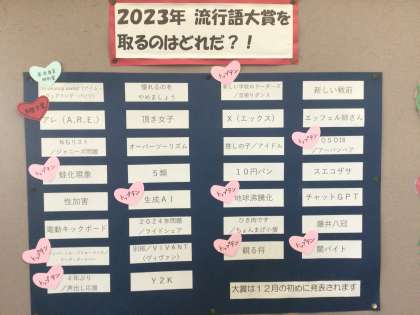 図書館の前の掲示板に、流行語大賞にノミネートされた言葉が掲示されていました。