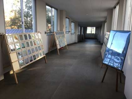 南校舎と北校舎の渡り廊下に、美術の時間に生徒が制作した作品が展示してあります。