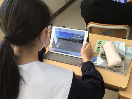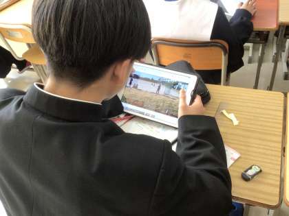 音の伝わり方の実験を終え、教室で実験の様子を撮影した動画を確認していました。