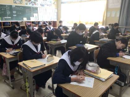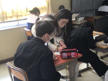 クリスマスカードらしくイラストに色を塗ったり、ALTの先生に筆記体の書き方を教えてもらったりする生徒もいました。