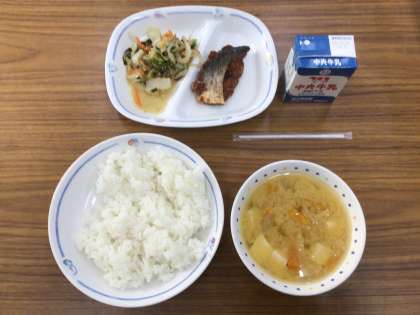 ごはん、かぼちゃのみそ汁、ぶりのゆず風味揚げ、はくさいのごまあえ、牛乳です。